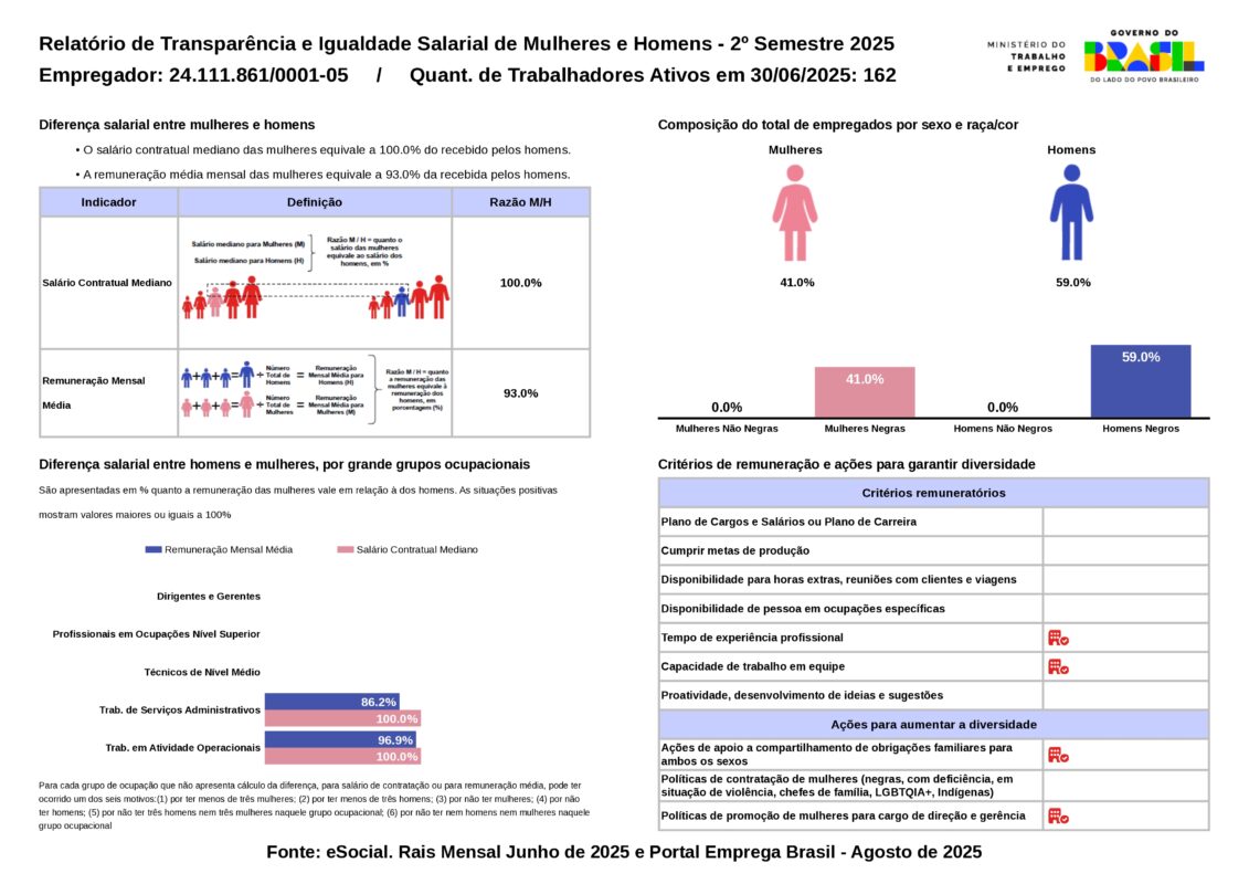 De acordo com à Lei nº 14.611 de 04 de Julho de 2023, divulgamos nosso Relatório de Transparência e Igualdade Salarial de Mulheres e Homens que foi elaborado pelo Ministério do Trabalho e Emprego (MTE), do Governo Federal, com base nas informações do e-Social de 2025 e Portal Emprega Brasil (em agosto de 2025).